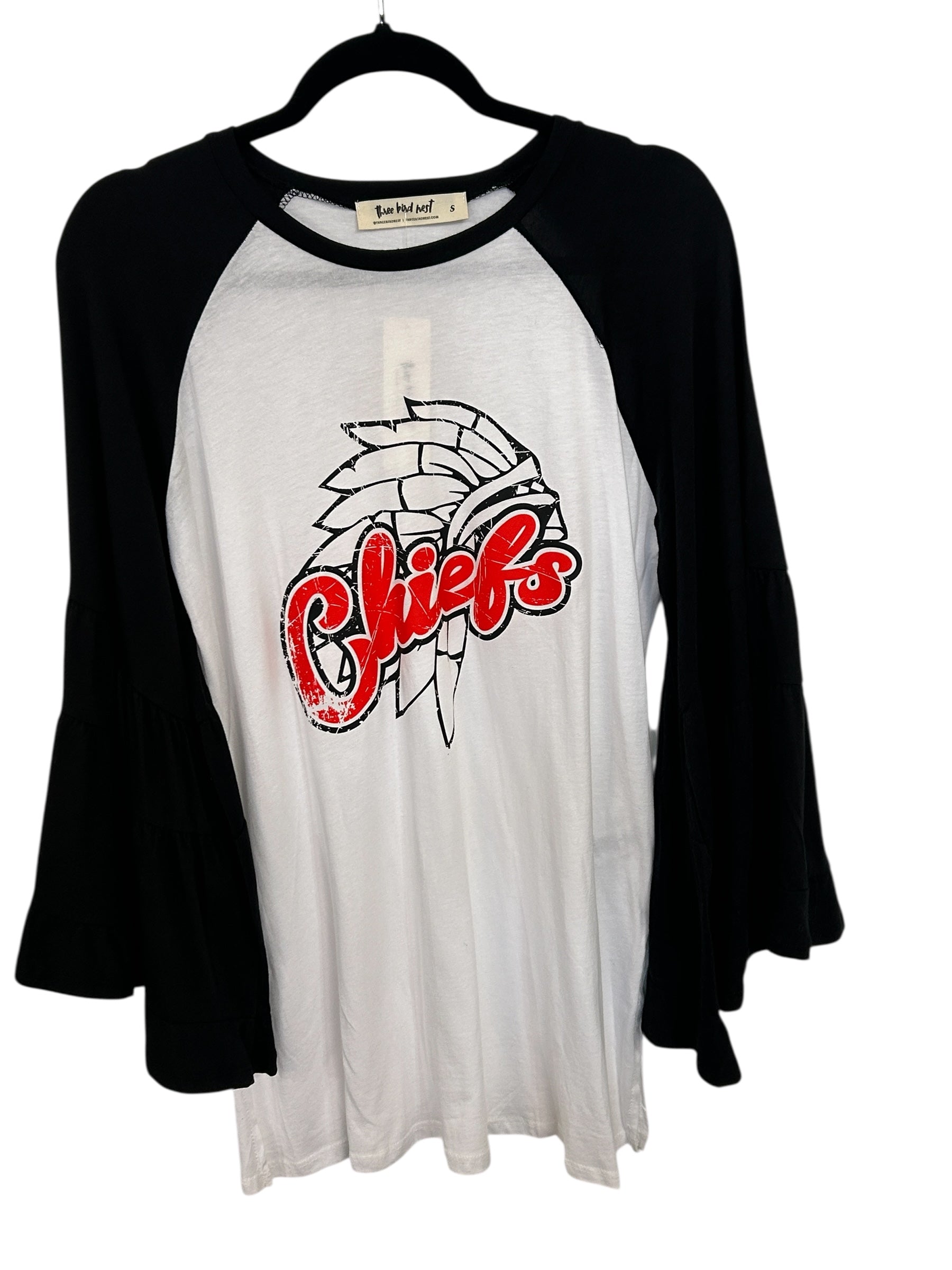 This is the one that has all the fun with the sweet style of a baseball tee, a roomy fit, and tiered flounce in these boho-chic bell sleeves. Soft knit is just right for this tunic length tee with side-slits and classic contrast at the crewneck.