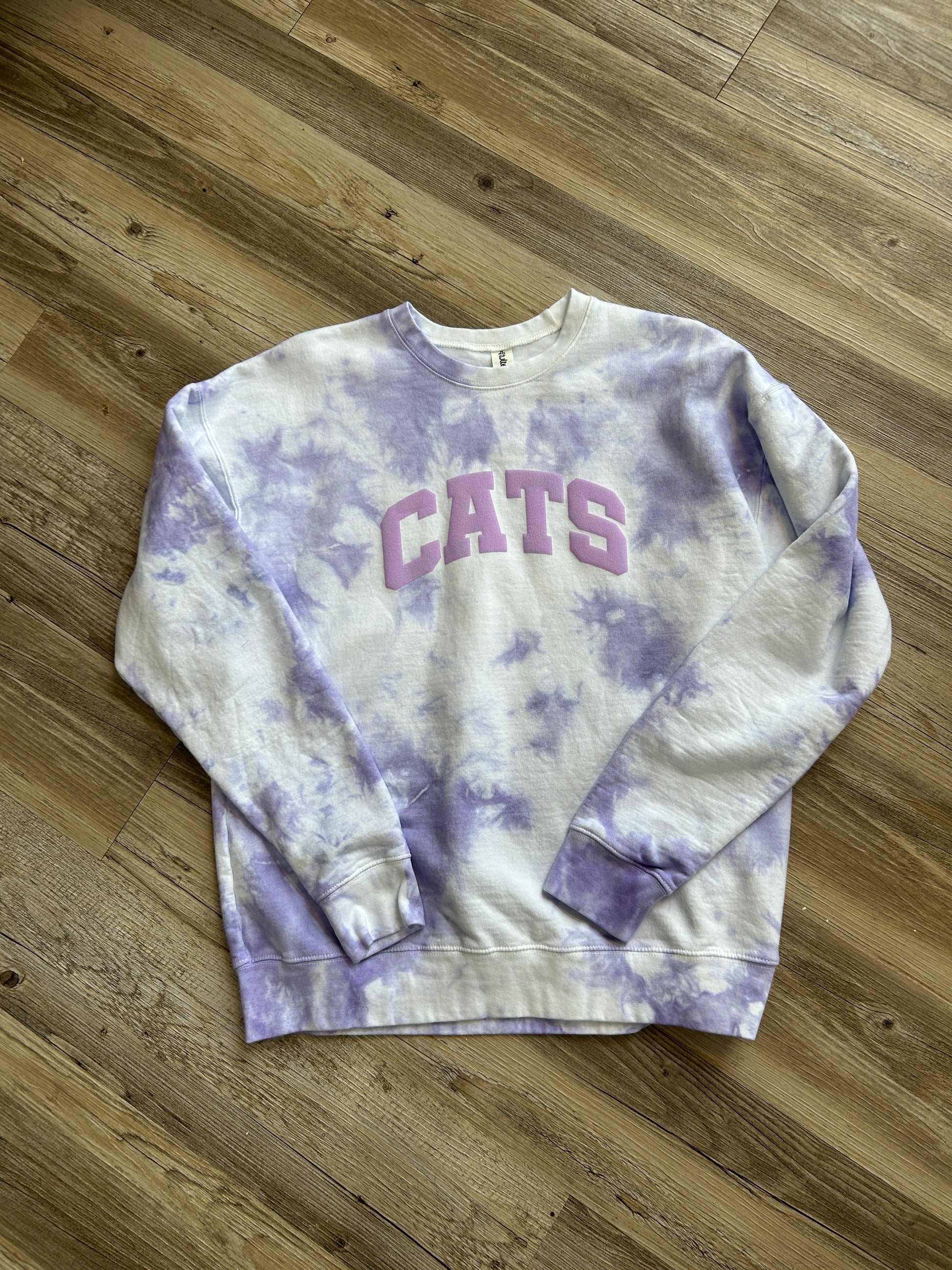 Light purple tie dye Tultex sweatshirt with puff CATS! Cute overload!! Made by our FAV tee/sweatshirt vendor Curly Top Customs in Topeka KS!