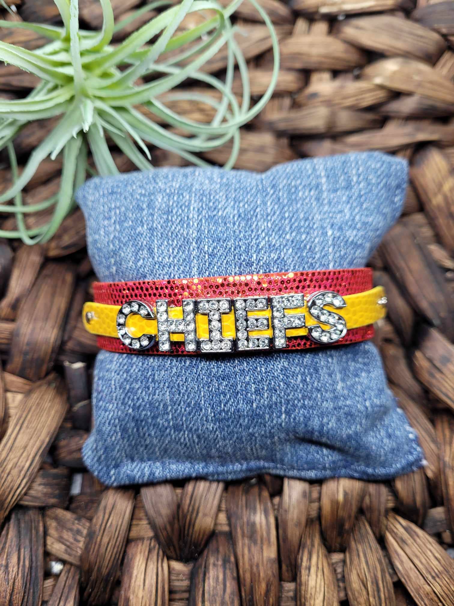 Show your team spirit with this adjustable Chiefs Rhinestone letter leather bracelet with adjustable snap closure!