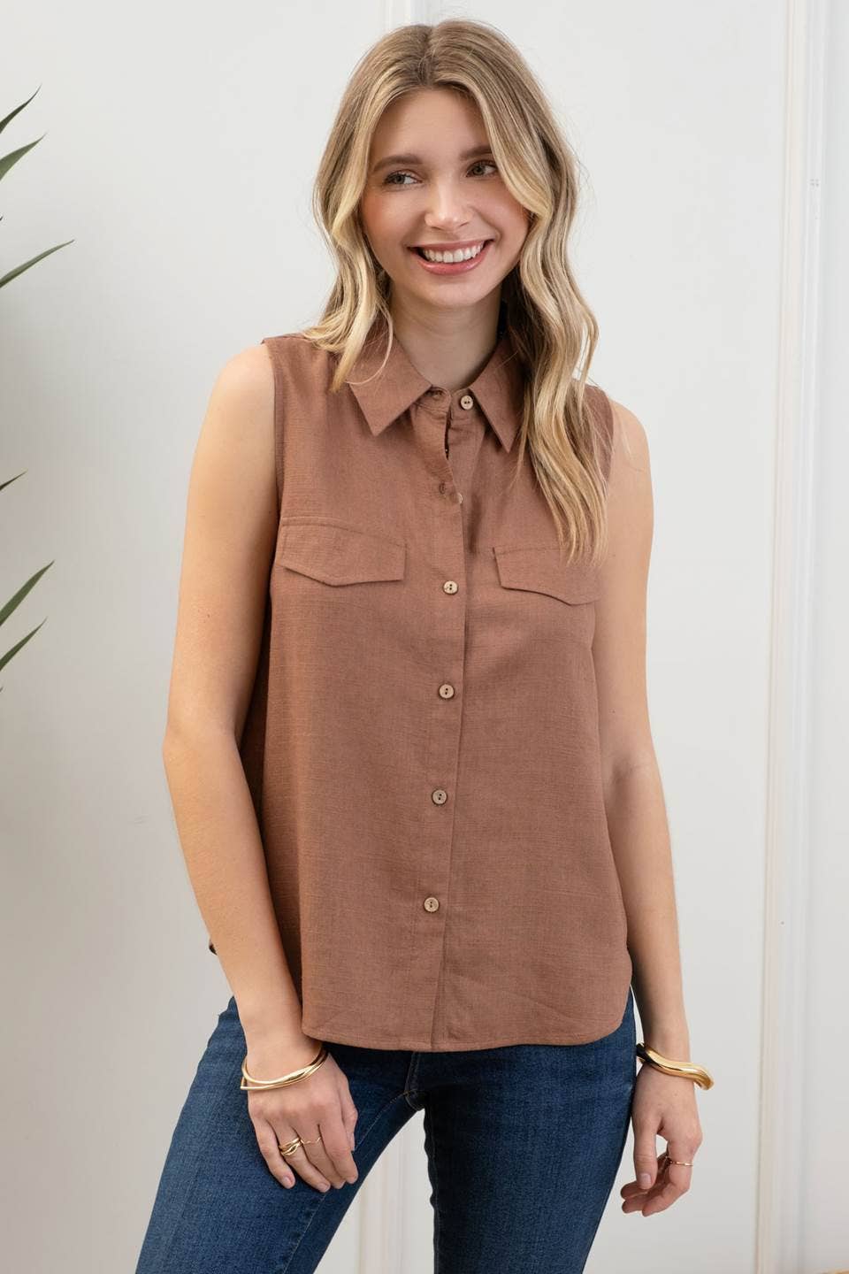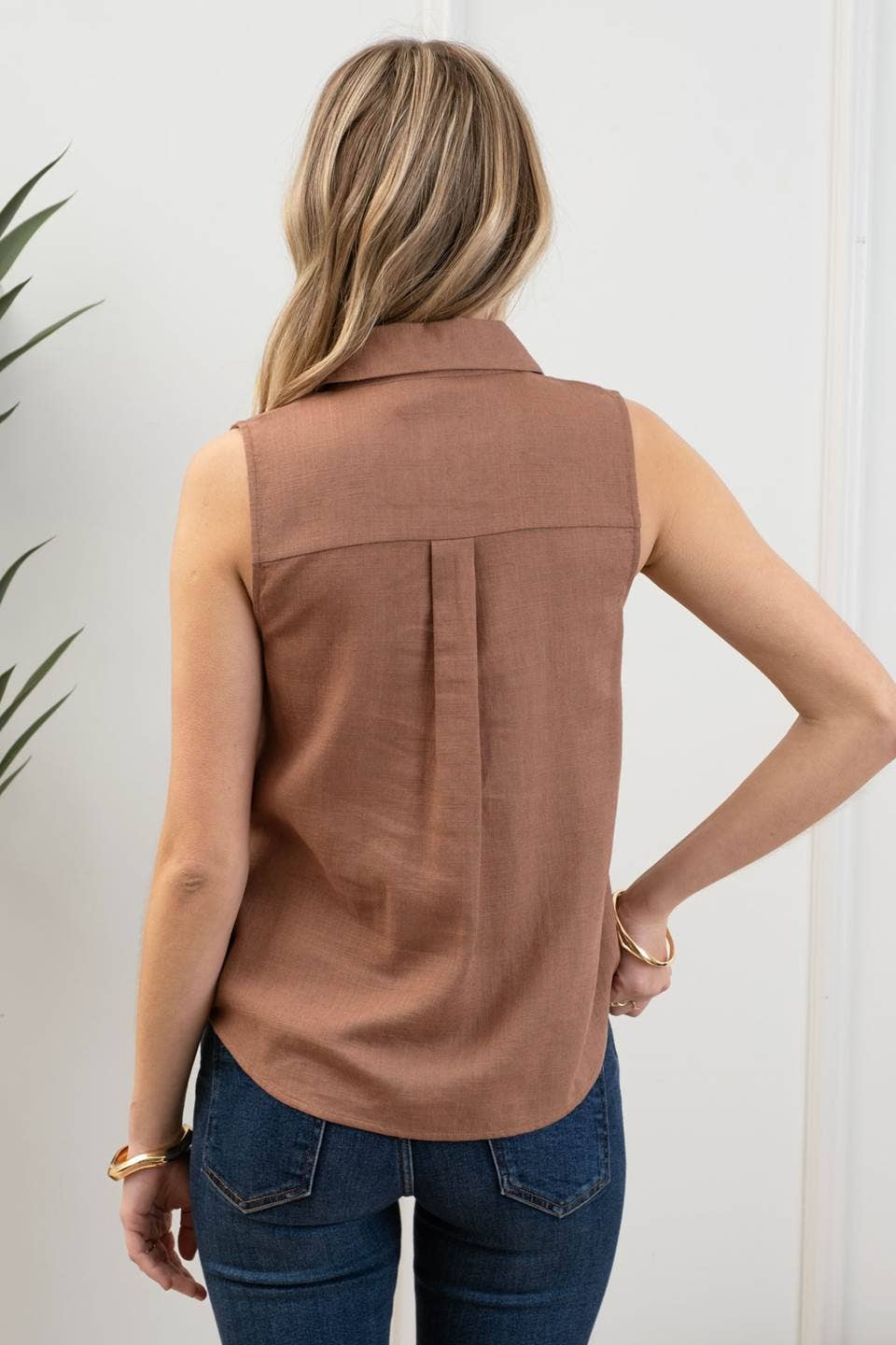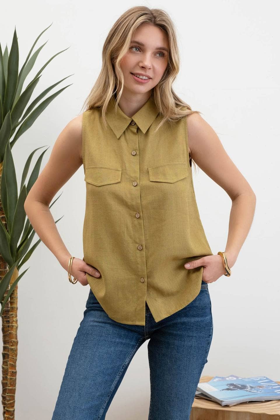 COLLARED SLEEVELESS BUTTON DOWN MOCK POCKET TAB BACK YOKE DETAIL BLOUSE 80% RAYON, 20% LINEN