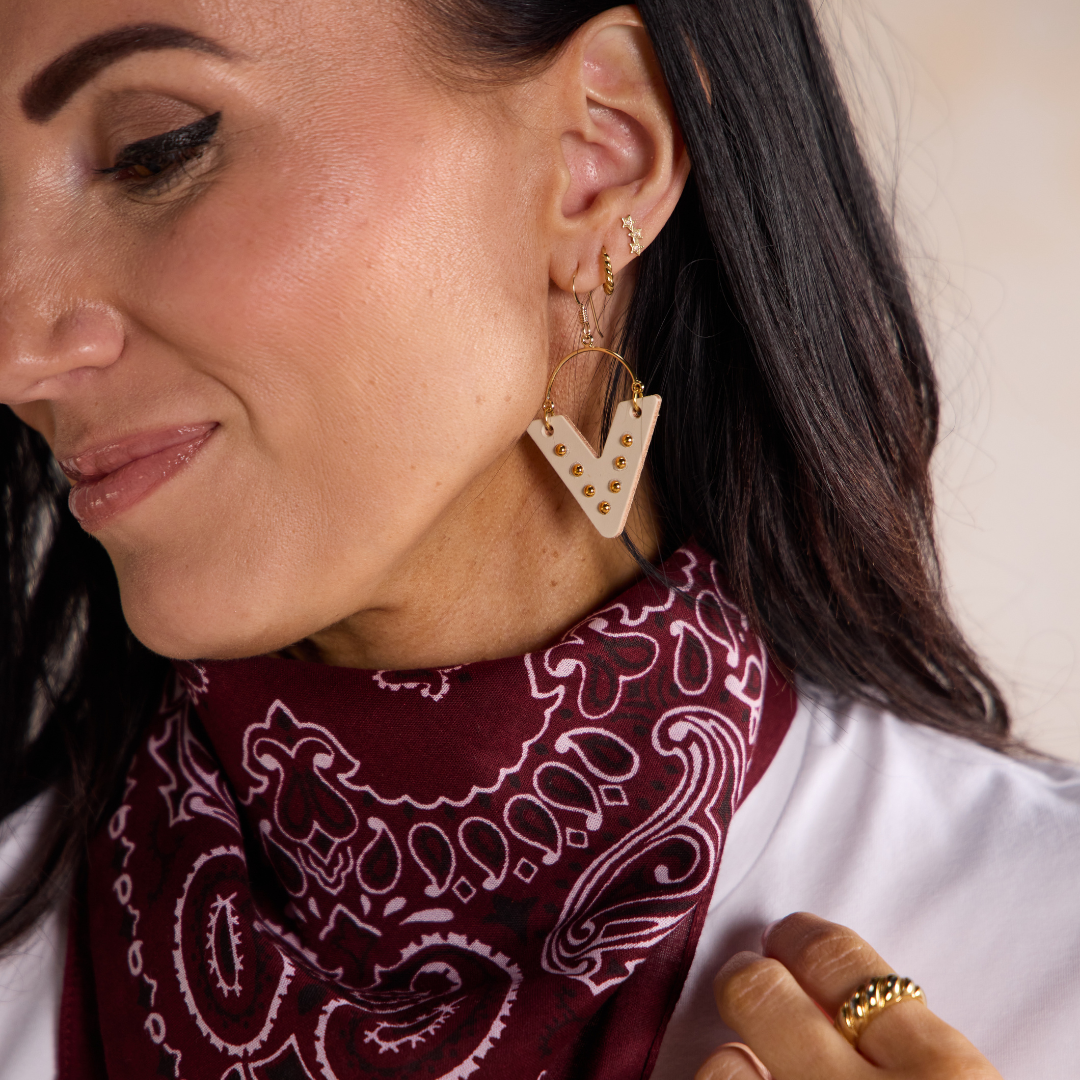 Make a statement with the Ecru Studded Sutton earrings. They feature a geometric shape and are crafted with gold or silver studs applied individually by hand.
