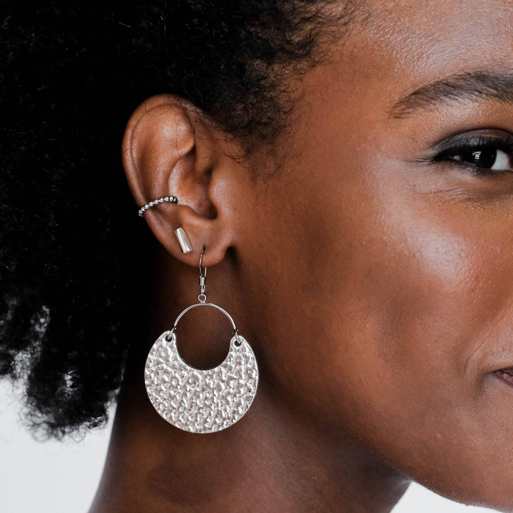 Our new favorite, the Ninas are a fresh take on the rounded crescent shape. This style is made with our metallic Hammered Silver leather, and available on sterling silver hardware.