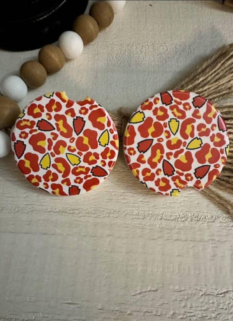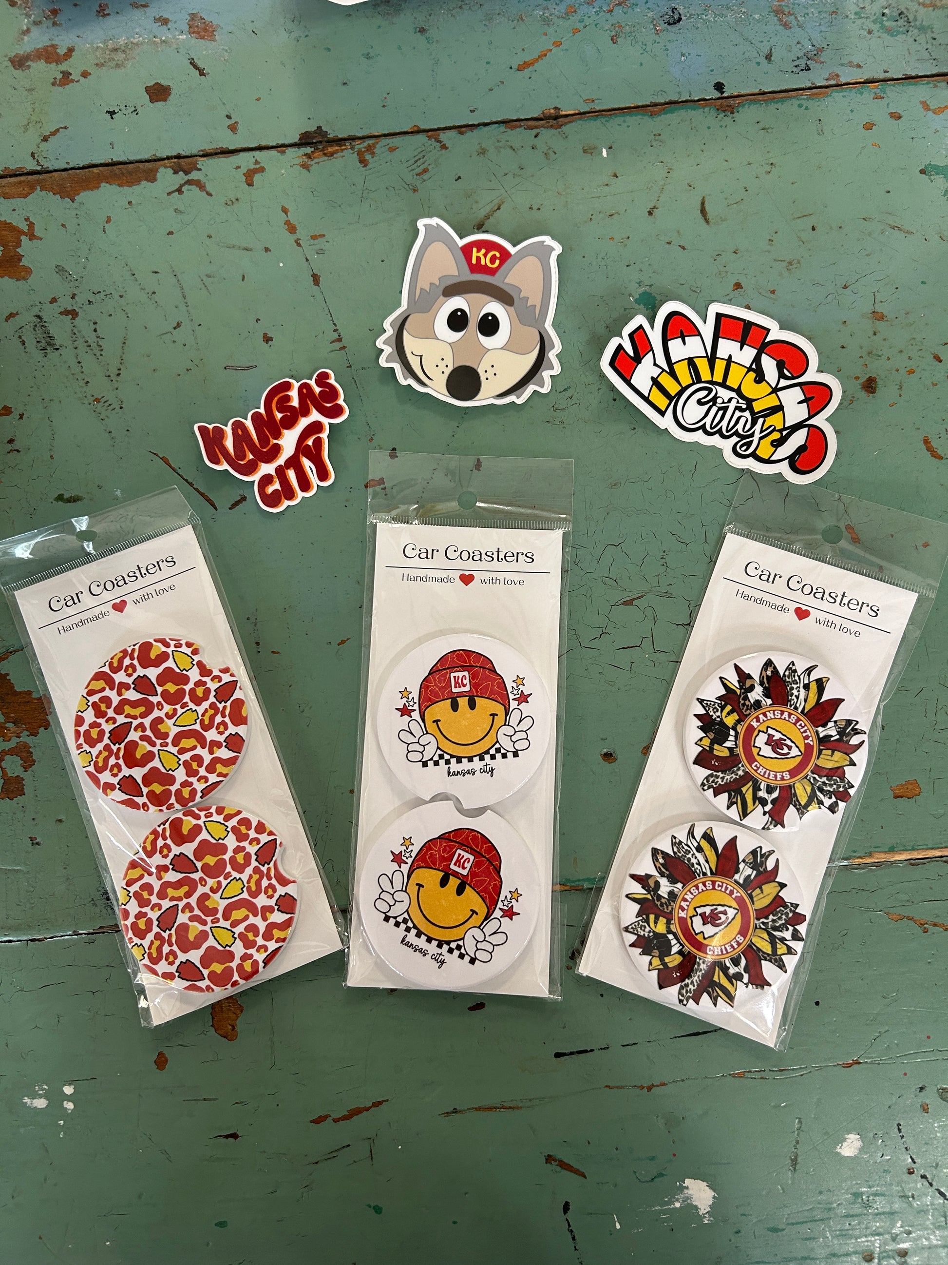 Our car coasters are individually created, printed with ink, and set with UV for durability. They are shipped from our small business in Kansas City, Missouri. They come in sets of two wrapped in retail packaging ready to be sold in your store!