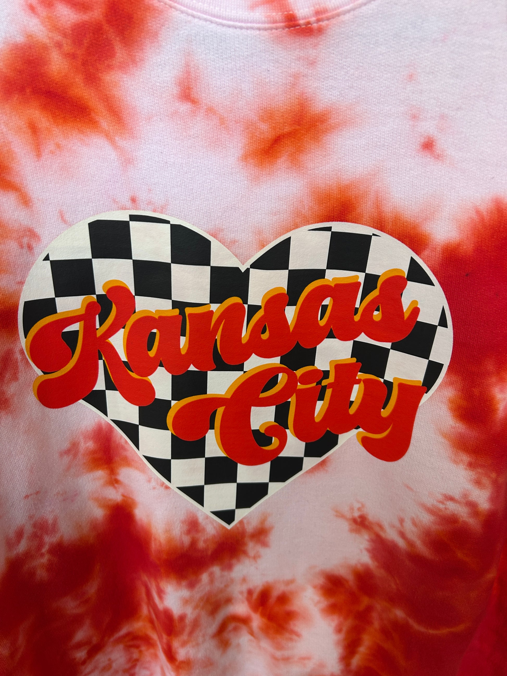 Beautiful and Bright orange, yellow and red tie dye with a checkered heart with script Kansas City! Celebrate your team in color!!