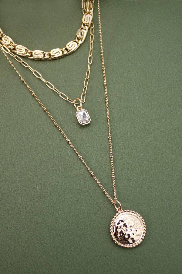 A unique and stunning multi layer necklace featuring beaded with coin charm, paper link chain and snail chain
