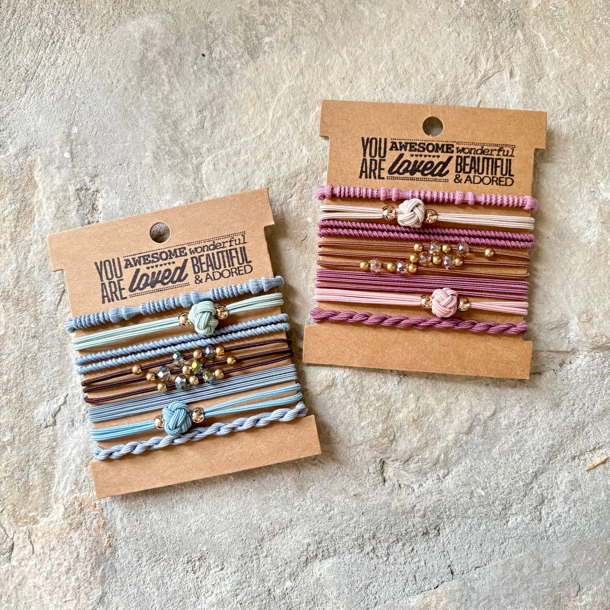 These Boho style hair ties are unique, decorative and oh so cute! Whether using your hair ties to hold up that luscious ponytail or stacking them on your wrist to add some outfit pizzazz, you can't go wrong. Hair ties come on a recycled card complete with words of encouragement that will surely put a smile on her face!