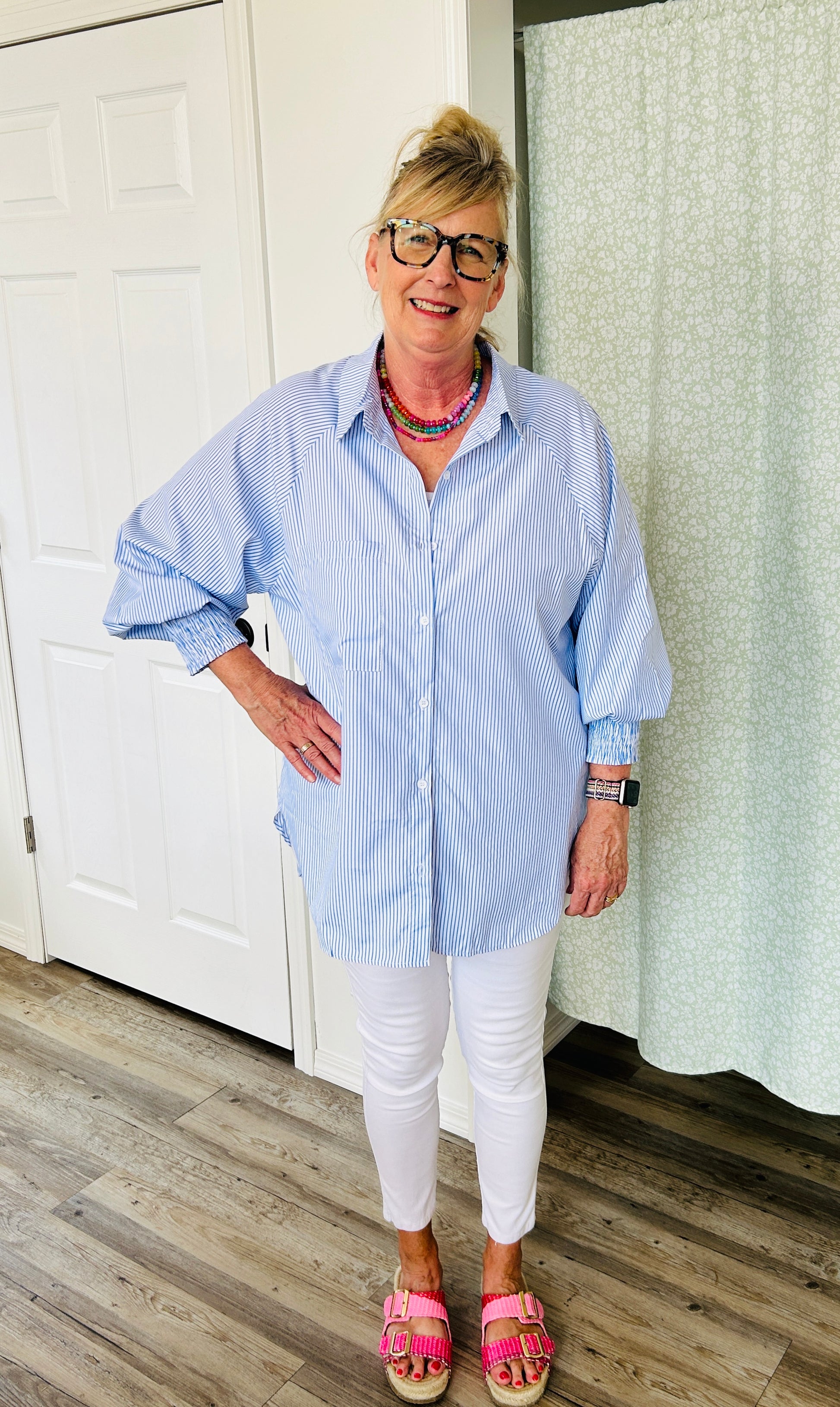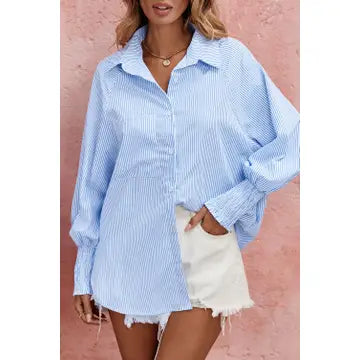 This oversized boyfriend shirt is both stylish and comfortable, making it the perfect addition to your summer or fall wardrobe. The smocked cuffs add a touch of sophistication, while the pockets provide convenience. A must-have for any fashion-forward individual.