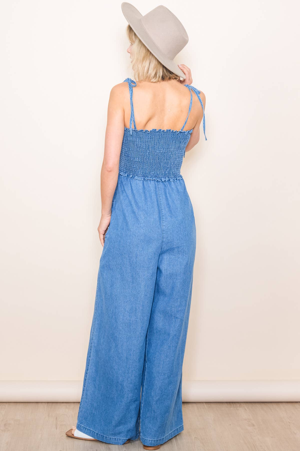 Vintage washed finish jumpsuit for Spring! Featuring a smocked chest and adjustable straps for comfort, it boasts two pockets for convenience. The relaxed fit and wide legs offer a trendy yet comfortable style for any occasion.