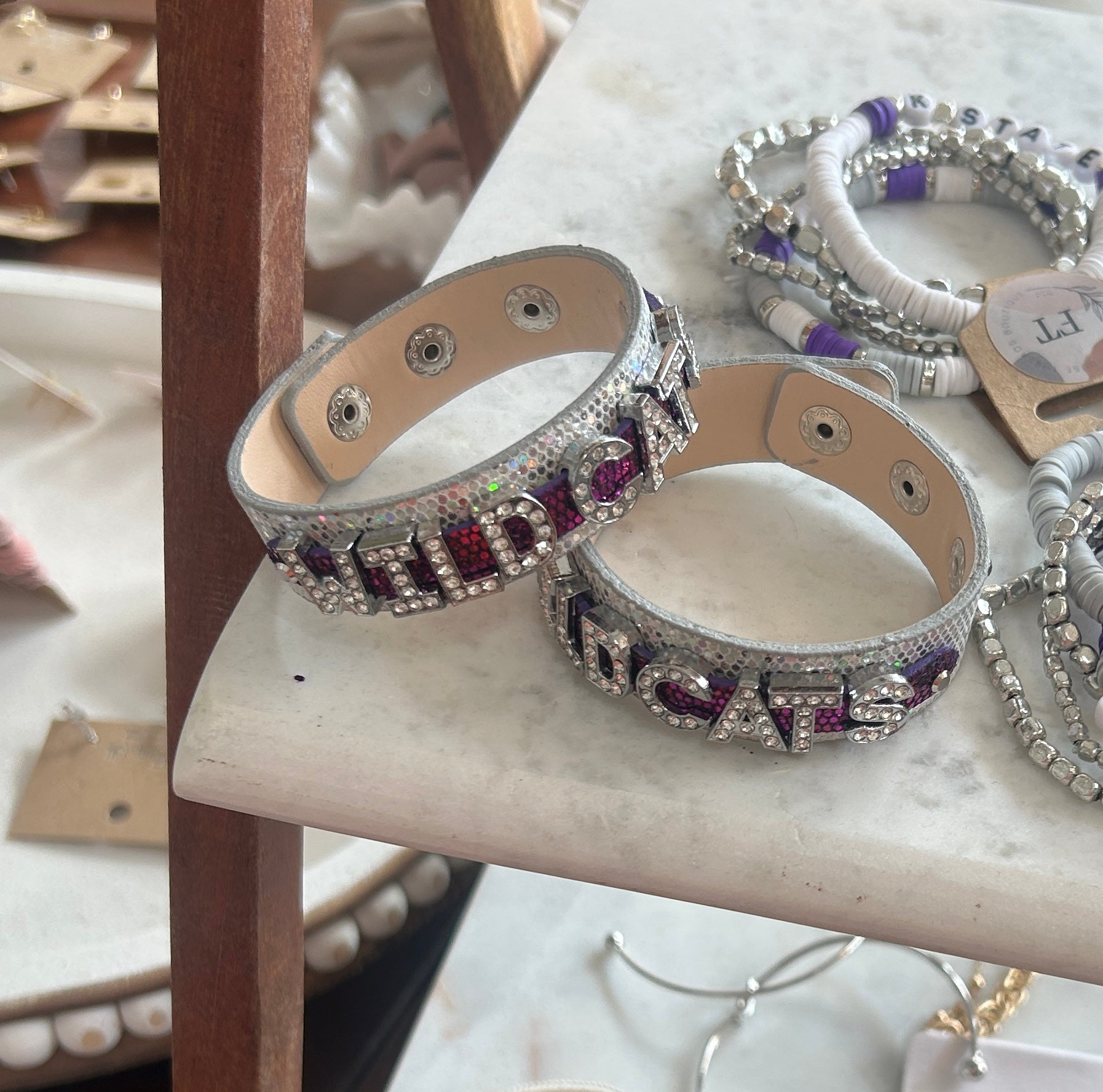 Show your team spirit with this adjustable Wildcats Rhinestone letter bracelet! Leather strap with snap adjustable closure.